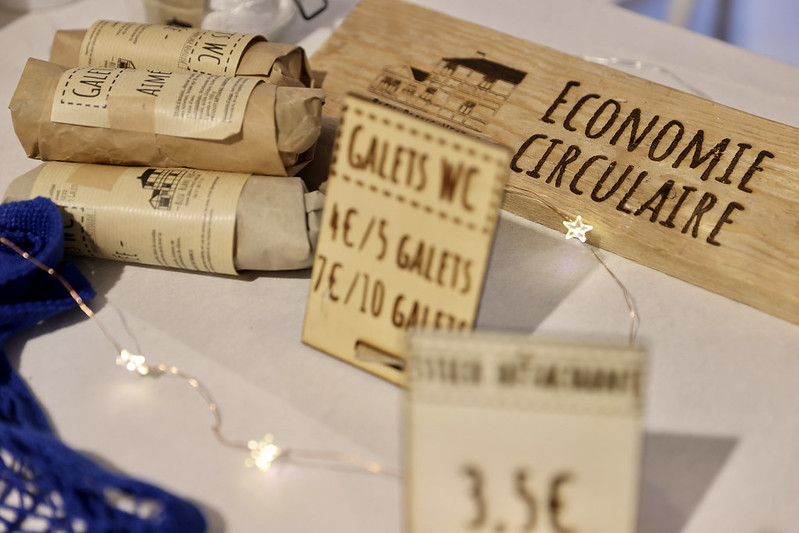 C’est ma fille qui pense les étiquettes des produits, les petits modules que l’on met sur le stand. Les pancartes sont faites sur des cagettes recyclées pour éviter de créer du déchet