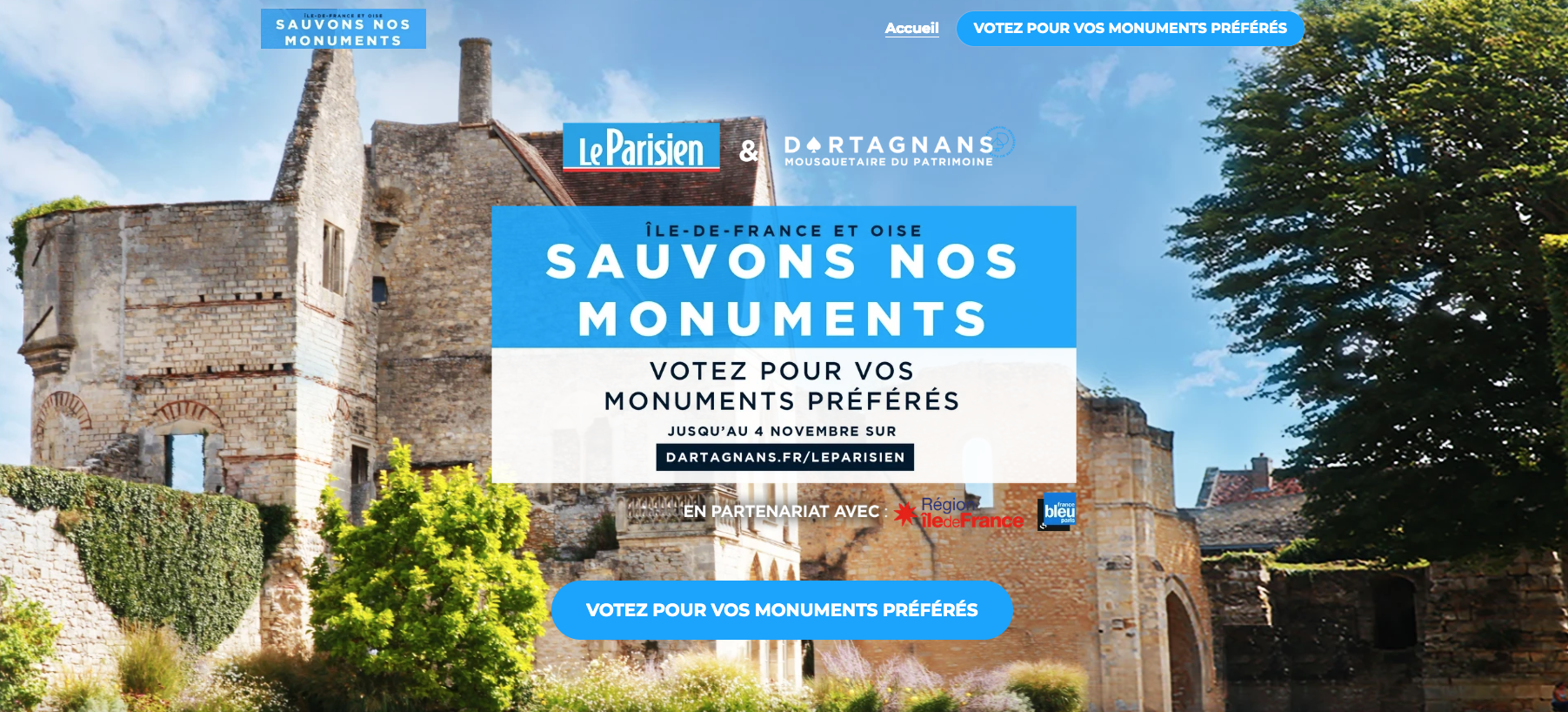 Le patrimoine francilien a besoin de vous ! Le journal Le Parisien en partenariat avec Dartagnans lance l’opération « Sauvons nos monuments ». Vous avez jusqu’au 4 novembre 2019 pour voter pour vos monuments favoris. Les lauréats bénéficieront d’une campagne de financement participatif. À vos clics !