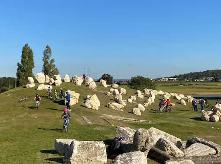 Car oui, la particularité du Stade de VTT Trial d’Epône, c’est qu’il est entièrement fait en réemploi. Les collines ont été réalisées avec les remblais des chantiers alentours. Les agrès eux, sont des mobiliers urbains vieillissants ou plus utilisés de nos jours. On y retrouver des vieux poteaux électriques, des tubes de chantiers en béton… Seules des pierres, en provenance de la forêt de Fontainebleau, ont été apportées artificiellement. Au total, 150m2 de rock garden, 300m2 de zone trial et 600m2 de pumptrack. Sur un complexe de 9ha, c’est le premier site labellisé en France pour cette pratique.