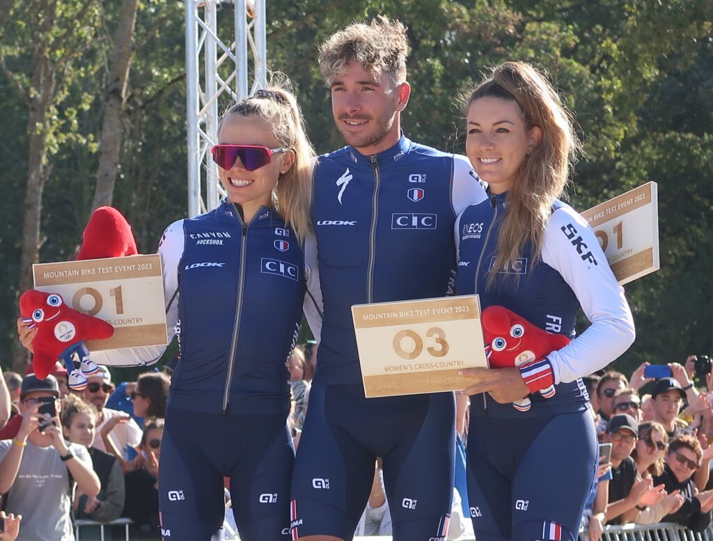 Les français à l’honneur lors du test évent. De gauche à droite, Loana Lecomte, vainqueur de l’épreuve femme, Victor Koretzky, victorieux chez les hommes et Pauline Ferrand-Prévot, troisième chez les dames. CD78/Y.Fossey
