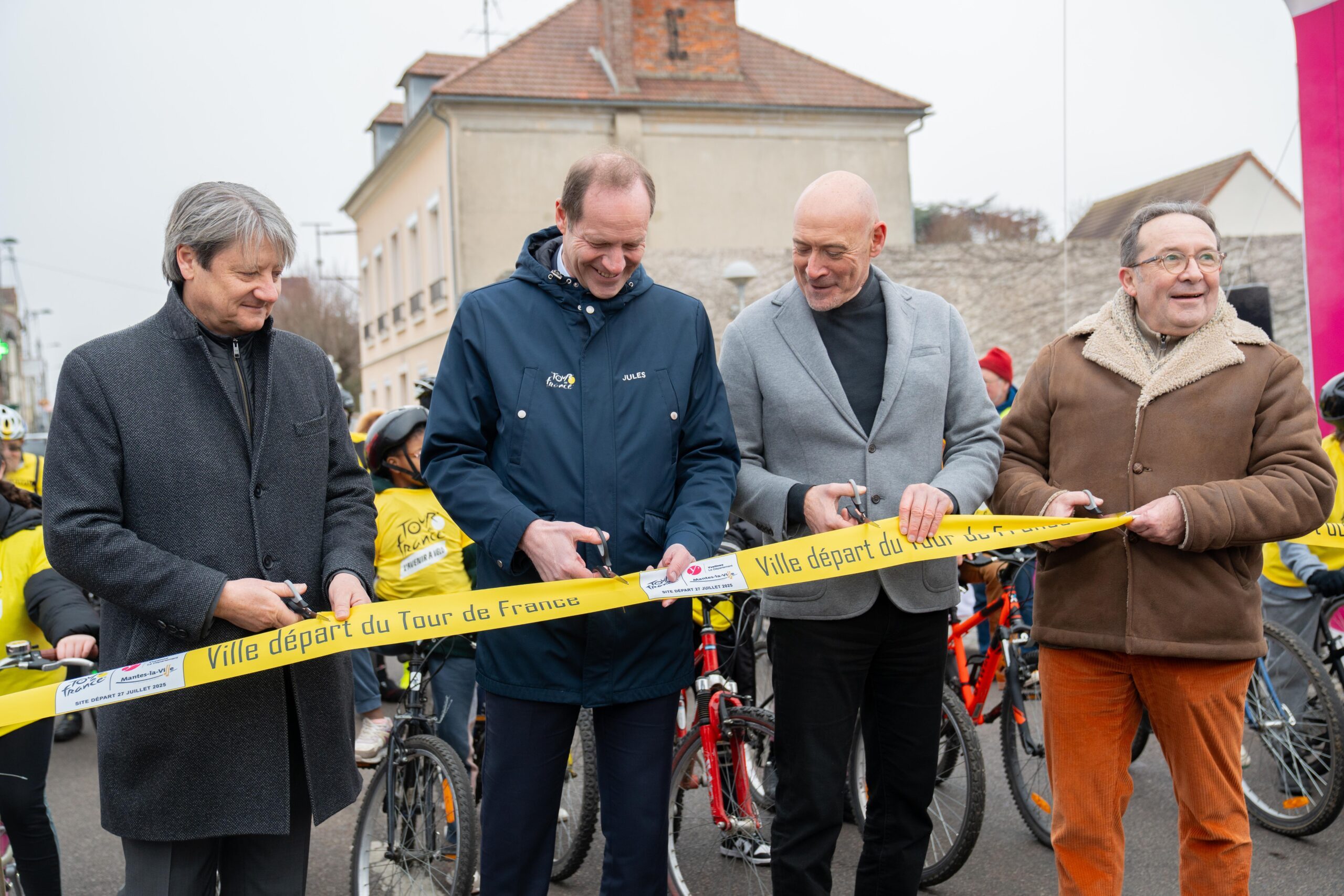 Depuis 2019, ce partenariat entre le Département et A.S.O prévoit le départ de la dernière étape de la course depuis une commune yvelinoise, en direction des Champs-Elysées. Et pour 2025, c’est Mantes-la-Ville qui a été plébiscitée « pour mettre en valeur la commune, mais aussi le Département dans toute sa diversité », conclu Pierre Bédier. Pour inaugurer la ligne officielle de départ, près de six mois avant le coup d’envoi, un coupé de ruban a eu lieu en présence de membres du milieu cycliste et enfants de la ville.