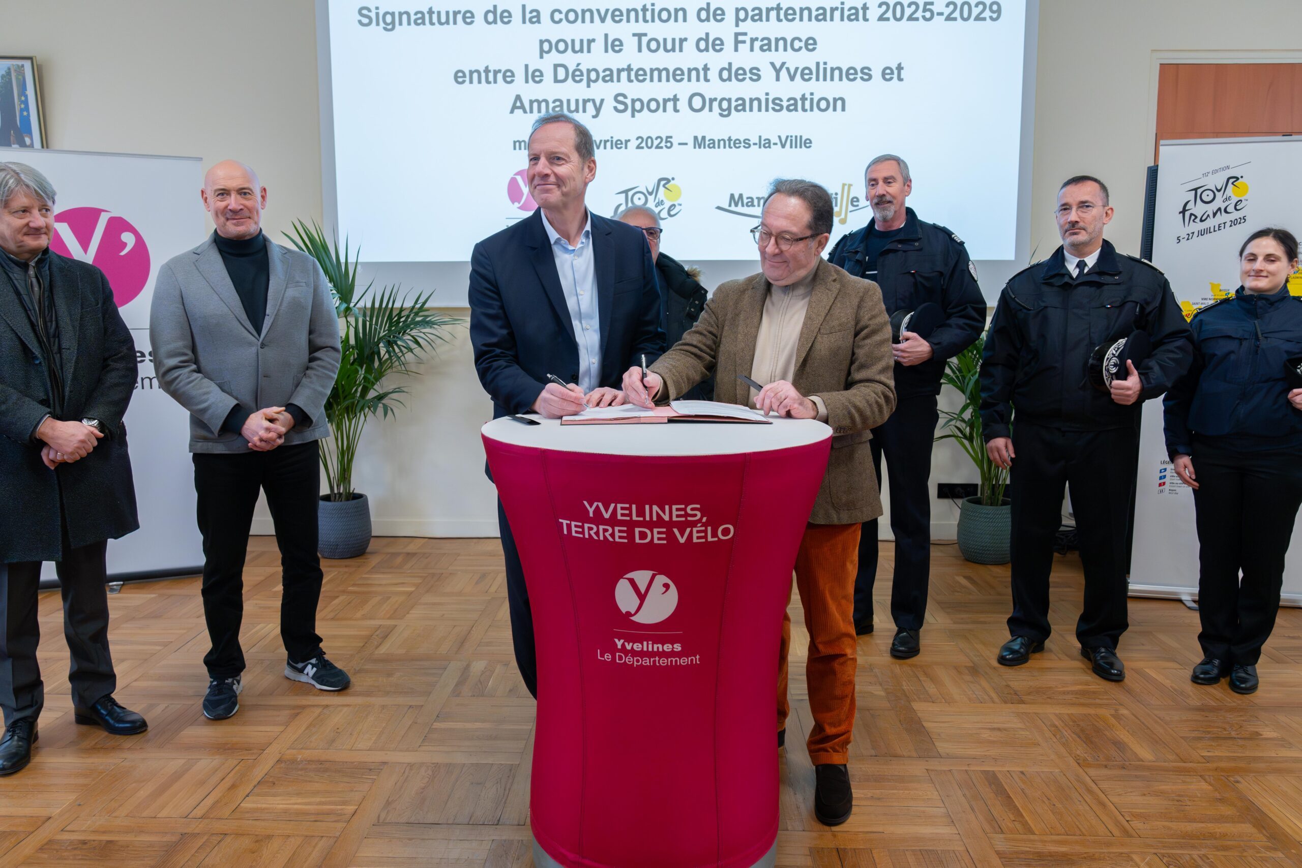 Mardi 4 février, l’ambiance était au rendez-vous dans le Mantois. Plusieurs personnes se sont donné rendez-vous sur la place de la mairie de Mantes-la-Ville pour la révélation de la ligne de départ officielle de la dernière étape de la Grande Boucle. L’occasion, dans un même temps, de procéder à la signature de la convention de partenariat du Tour de France entre A.S.O et le Département, qui court jusqu’en 2029.